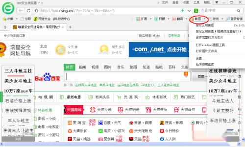 5、浏览器截图,百度,360,搜狗等浏览器上方都带有截图按钮,都可以直接点击截图按钮进行截图,方法和qq截图方法一样,这种截图方式比较灵活,可以自己随心所欲的拖选截图的区域,截好后还可以随意编辑,非常方便,和qq登录截图不同的是:浏览器截图,也可以在不联网的情况下很方便的使用。