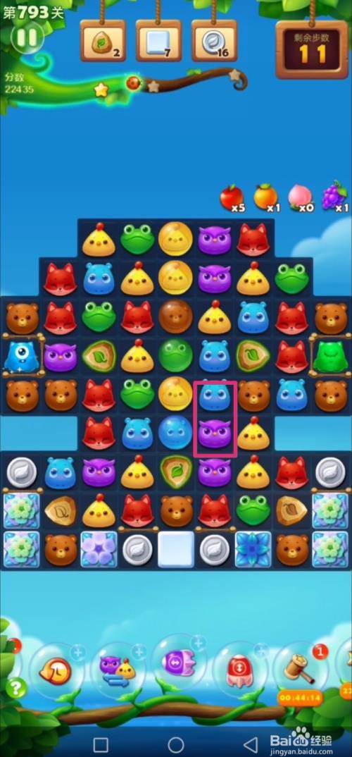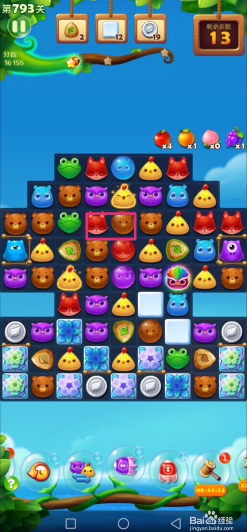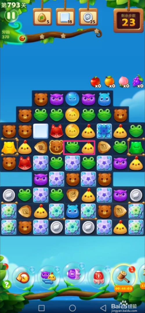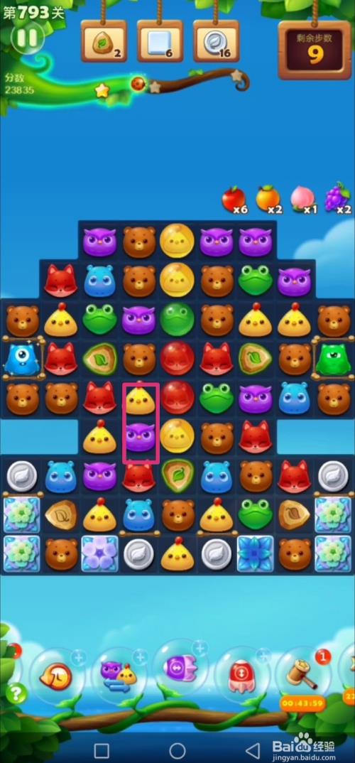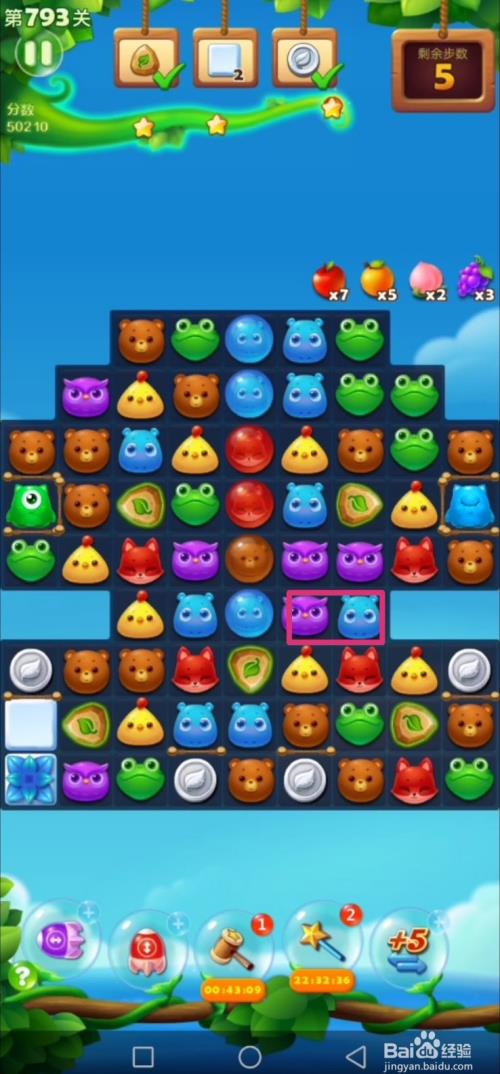 7、小鸡与狐狸互换形成魔力鸟并用掉了,再熊与猫头鹰互换触发石头特效,如图所示。