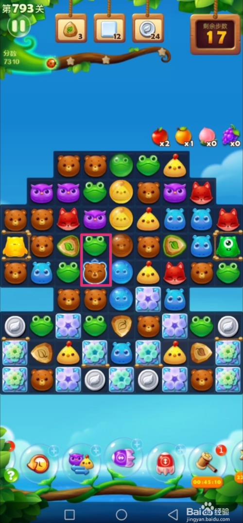 11、然后熊与小鸡互换消除冰块和银币,再猫头鹰与熊互换消除旁边的小动物,如图所示。