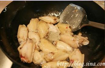 3、煸至两面发白,鸡皮收紧。