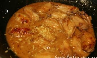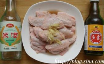 1、鸡翅中洗净后抹干水份,加入姜丝、广东米酒、生抽,抓匀后腌1小时至入味。