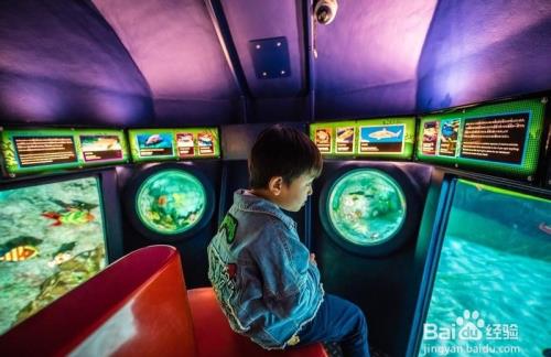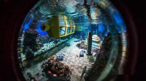4、启动之后,我们发现潜水艇的乘坐舱是低于水平面的,可以透过几扇大窗观察到外面的“海洋世界”,有乐高搭成的海洋生物,也有真实的彩色热带鱼和珊瑚礁,混杂在一起,不停有新的风景出现。