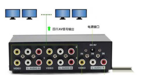 4、这就是av分频器,淘宝有卖,50, 60元就可以买到一款av分频器, 有了它,我们只需要从机顶盒接线到分频器av输入一般是(in put接口),然后从分频器输出两条av线分别连接到两台电视。