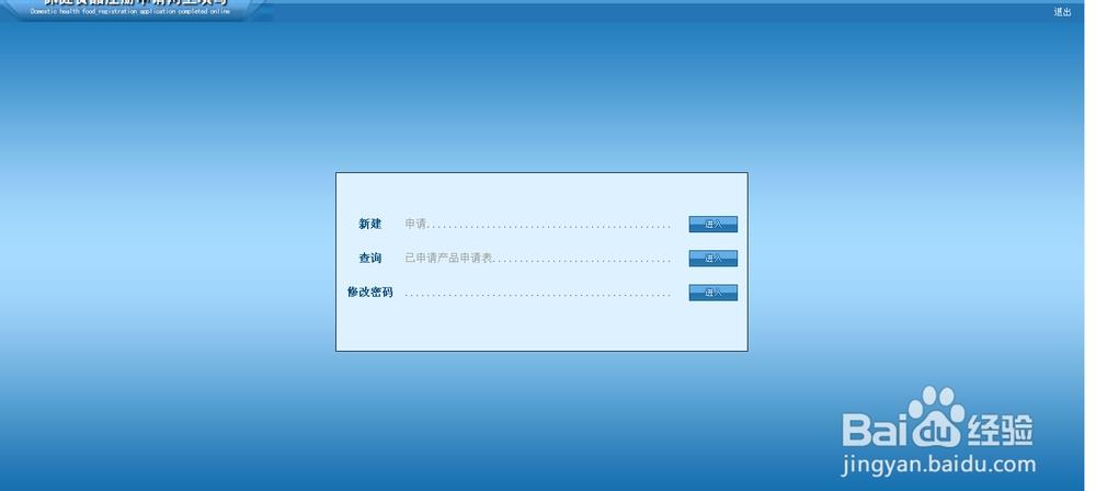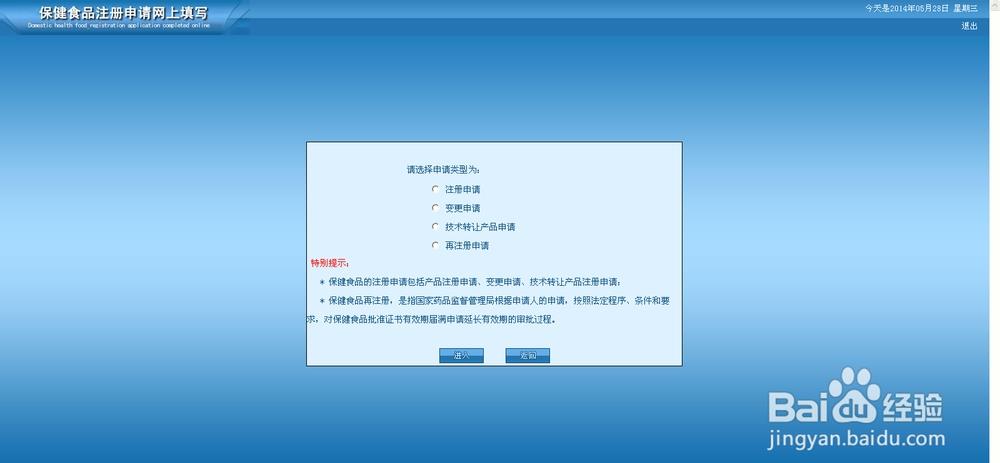 6、终于进入网站了,根据自己的情况,国产的产品就选择国产保健食品注册填写,进口的就选择进进口保健食品注册填写。特殊情况,保健食品技术转让中,如国产转进口要选择国产保健食品注册填写,反之,则选择进口保健食品注册填写。