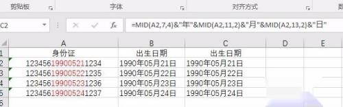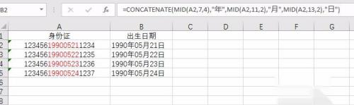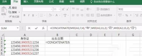 2、选中存放出生年月的单元格,输入“=concatenatemid(a2,7,4),"年",mid(a2,11,2),"月",mid(a2,13,2),"日"”,按下enter键,截取的出生年月如下图所示。