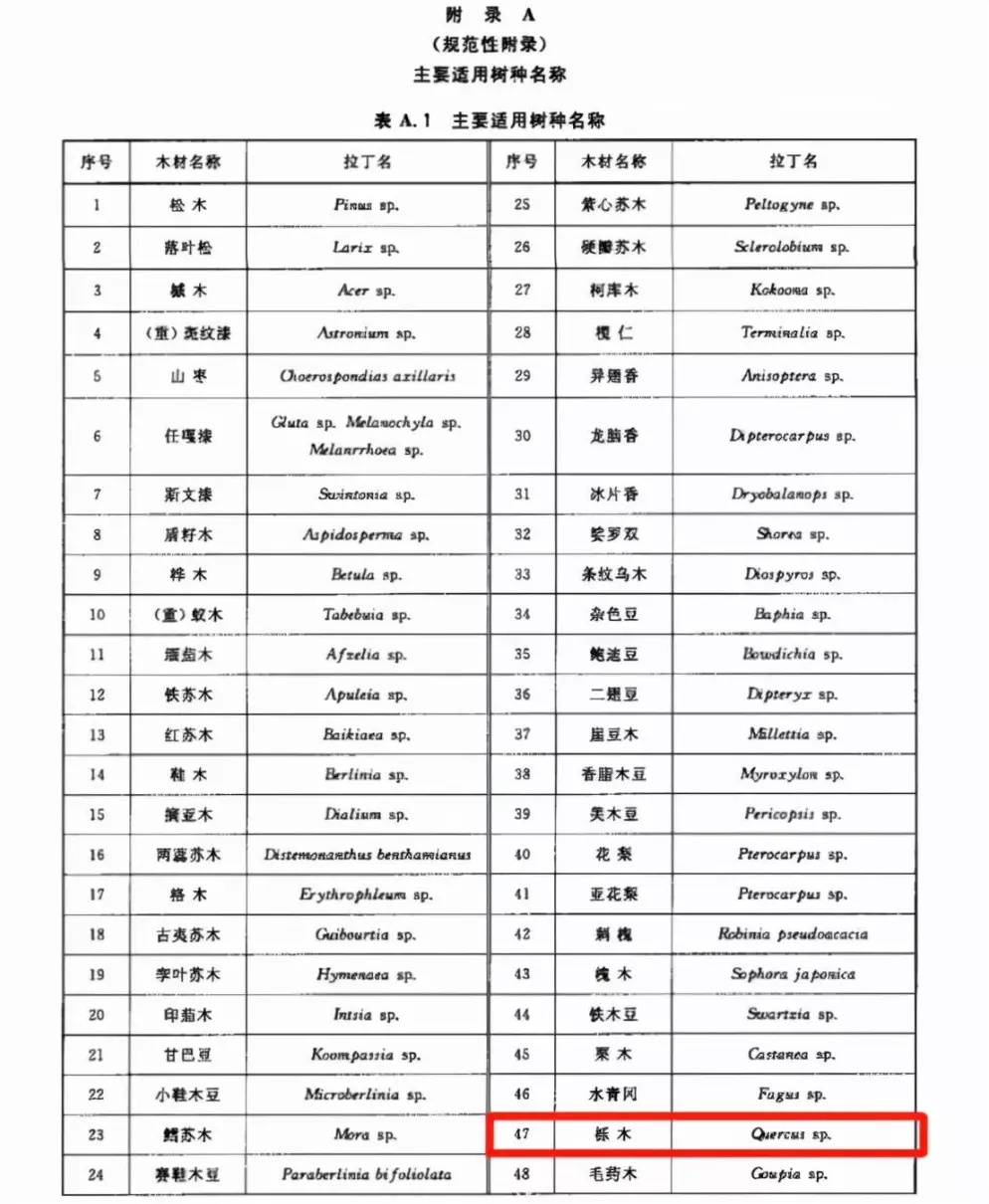 该标准对于实木地板树种也列出了主要适用树种名称,见下图