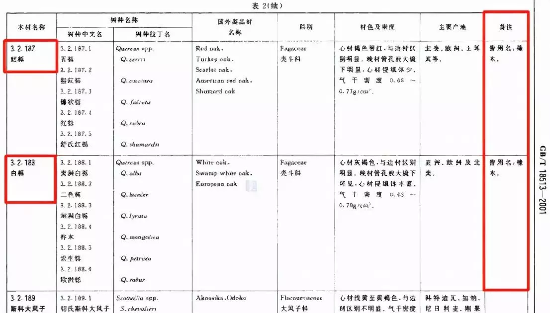 在GB/T 18513-2001中国主要进口木材名称也并没有找到橡木这一树种,而红栎和白栎也都可以统称为栎木。