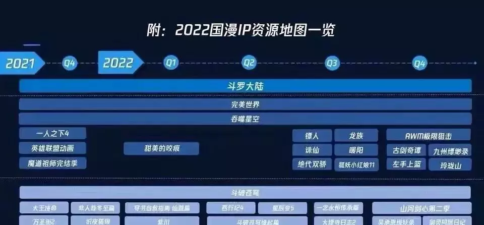 可以看到四部年番动漫:斗罗大陆、完美世界、吞噬星空、斗破苍穹,目前前两部已经在年番,吞噬星空12月30号开始年番,斗破苍穹三年之约后会有短暂的星辰变第四季接档,但是按照这个图上看,斗破苍穹第五季也有可能接档三年之约,而斗破苍穹特别篇-缘起则是2022年第二季度上映。