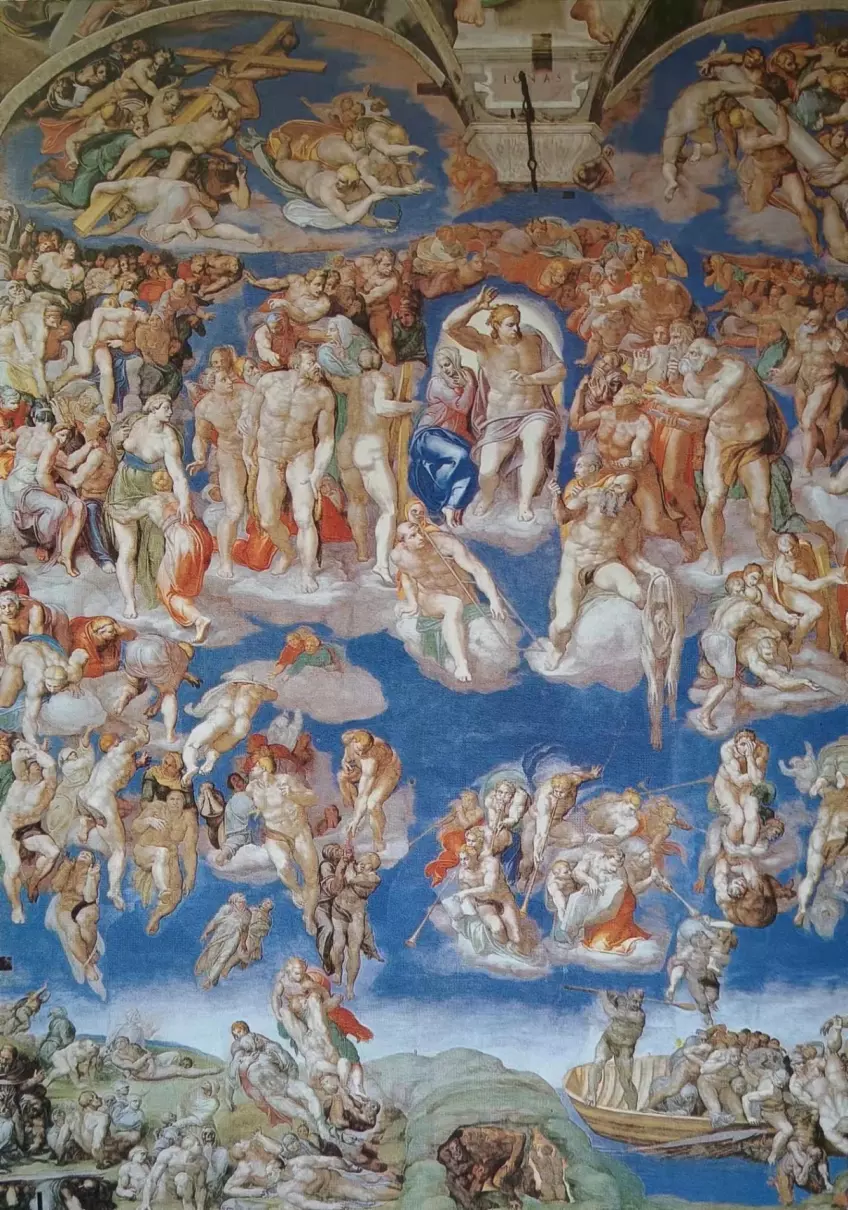 《最后的审判》是《创世纪》天顶画的姐妹作,画于西斯廷教堂的墙壁上,面积200平方米,宏伟的场面显示出米开朗基罗丰富的想象力和非凡的气魄。这幅画表现天堂和地狱间永恒的斗争,象征性地描绘了人类的归宿,使人看到铁面无情的、可怕的因果定律。黑沉沉的天空背景上,出现了如同被暴风雨卷起的一群人像,以基督为中心,左边是圣徒、殉难者,右边是恶人被魔鬼推下地狱,左边是得救的灵魂,正升向天堂。这真是一幅表现人体的惊世之作,因而享有“人体百科全书”的称誉。