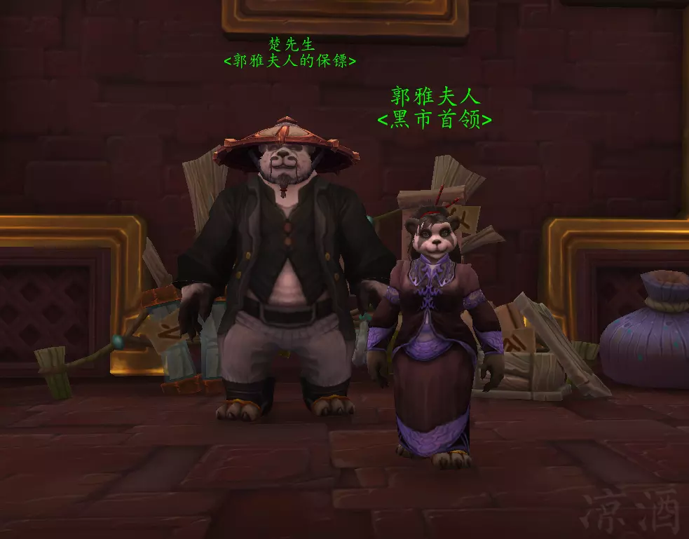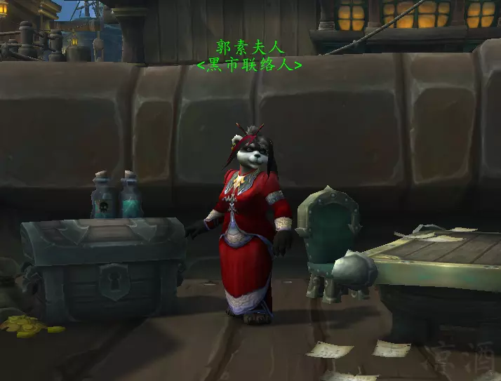 郭雅夫人想必大家都不陌生,是一个在熊猫人版本添加进游戏中的NPC,提供黑市服务,用来回收在玩家手中的金币,身边时常跟着艾泽拉斯第一大内高手楚先生: