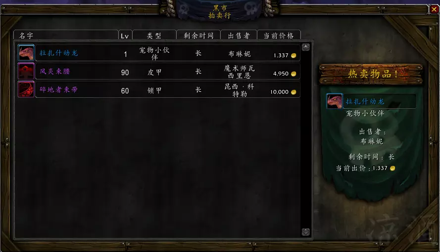 这些黑市的物品以拍卖的形式供所有同服务器玩家竞价,在剩余时间结束的时候,出价最高的玩家就可以获得该物品,当然,你也可以直接999999999999999999999999金币封顶,剥夺别的玩家竞价的机会,从而拿到你想要的物品,具体几个9咱也没试过,流下贫穷的泪水。