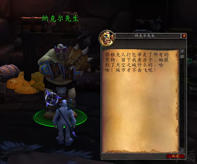 不得不说早期的这个细节还是有点意思的,显得很真实,毕竟郭雅夫人不能分身,所以搬走了之后原来的店就关张了——不像达拉然的某个大法师,都被炸死十来年了,还天天在那喊,耷拉耳的公民们,今天又有一个非酋没摸出来飞机头~