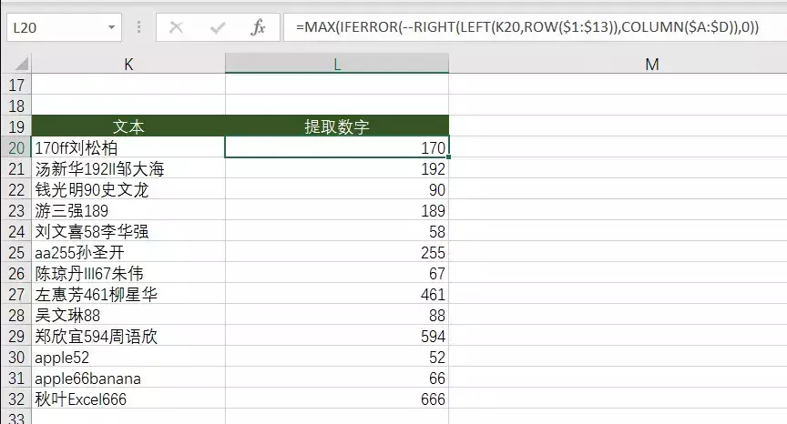 ❷LEFT(K20,ROW($1:$13)——从首个字符开始依次从右截取 1~13 个子字符串。
