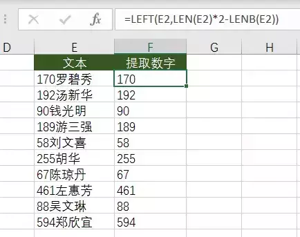 LEN(E2)*2-LENB(E2) 就是获取左边数字的个数,搭配 left 函数截取左边的数字。