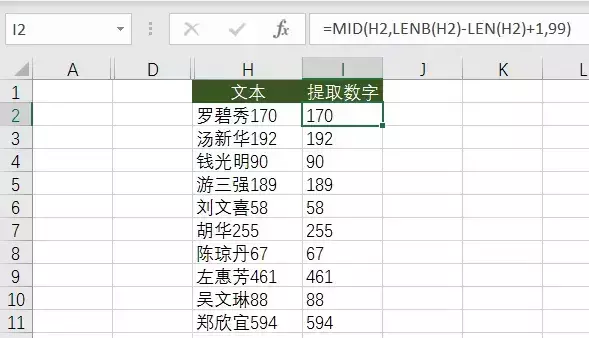 LENB(H2)-LEN(H2)主要是获得左边文本的个数,加上 1 后就是首个数字出现的位数。