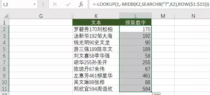 这里是利用 SEARCHB 函数的通配符查找功能,查找字符串中的数字。