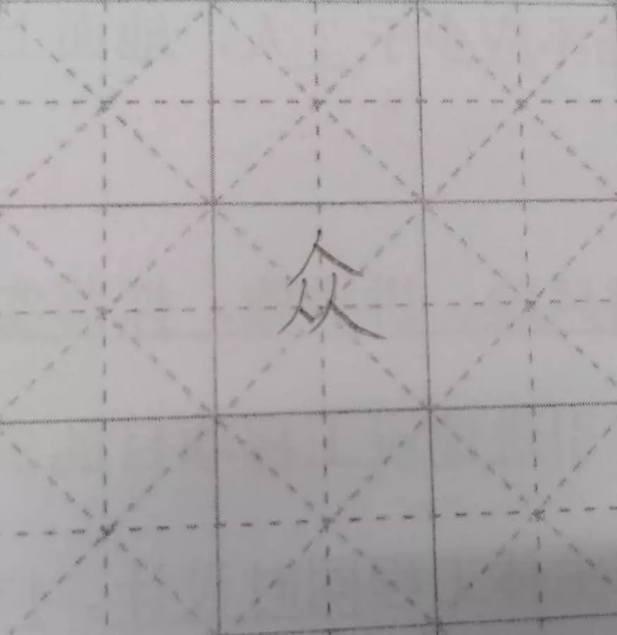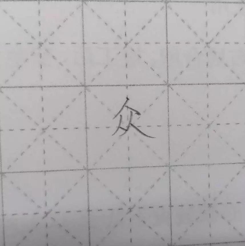 我看过很多书法老师的教学视频,众字的写法也是五花八门,有上面做反捺的,有下面未笔做反捺的,也有的老师是根据这个规范字的写法,就直接两个捺画都是正捺,上面短下面长点,反正是规范字,国家怎么规定他怎么教。