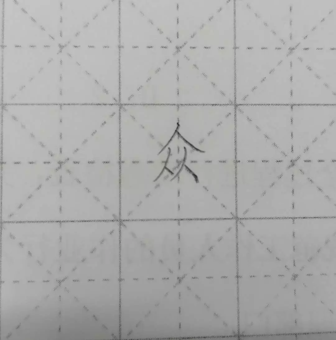 最后讲下第三种写法,第三种写法明显是参照“食”字的写法。但含人字头大部分的字,都是上大下小,上面覆盖下面的结构。比如会,全,金等。且食字下面的良字,属于瘦长型的字形,而众下面的从是一个稍宽的字形,一个人字头是包不住两个“人”的。所以,我的观点是赞成第二种写法,参照“炎”字,上面反捺,下方处理成斜捺,比较好看。