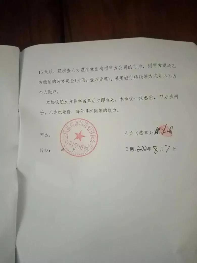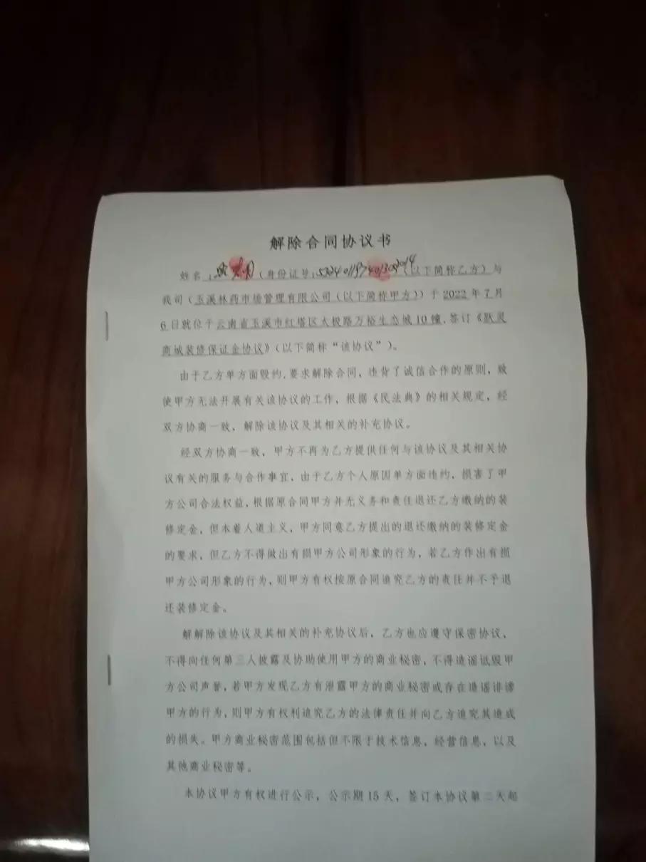 合同协议签了、装修保证交了。任礼飞任总说:以前个体经营可以,以后要公司才好操作。去申报时:说是共同投资、原来见的到的除:财务侯利兰侯总、任礼飞任总两人外,其他人都不见了,回来了解被辞退了……感觉风险太大 、无法承受,于是提出解除合同