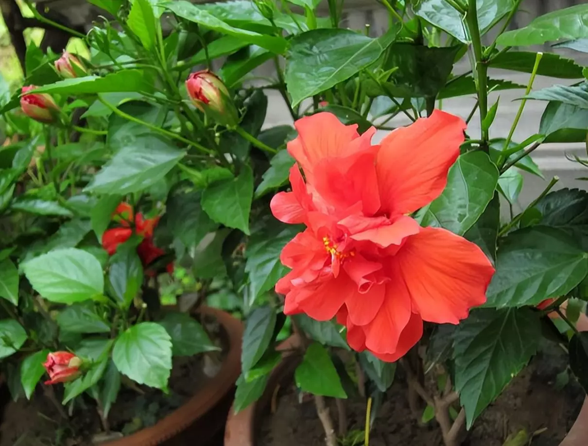 朱槿别称扶桑,因花多为红色,广东地区又叫它大红花。朱槿是锦葵科木槿属植物,花色鲜艳,花朵又大,四季开花不断。朱槿是非常喜阳的植物,但却不耐阴,不耐旱,也不耐寒,却耐修剪,萌芽力强。在园林上除了做灌木,也会做球形,做绿篱,还是会开花的绿篱。盛花期一排排地望过去,花朵十分艳丽。