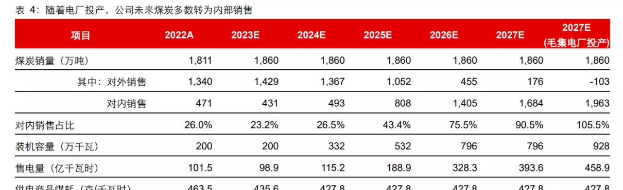随着电厂的投产,我们预计公司在未来,煤炭销售会逐渐全面转向内部销售,预计在 2027 年左右内部消化率达到 90%以上,如果考虑毛集电厂投产,则公司可以实现完全自产自销,甚至需要从外部采购煤炭补充不足,可以真正层面上实现煤电一体化经营。