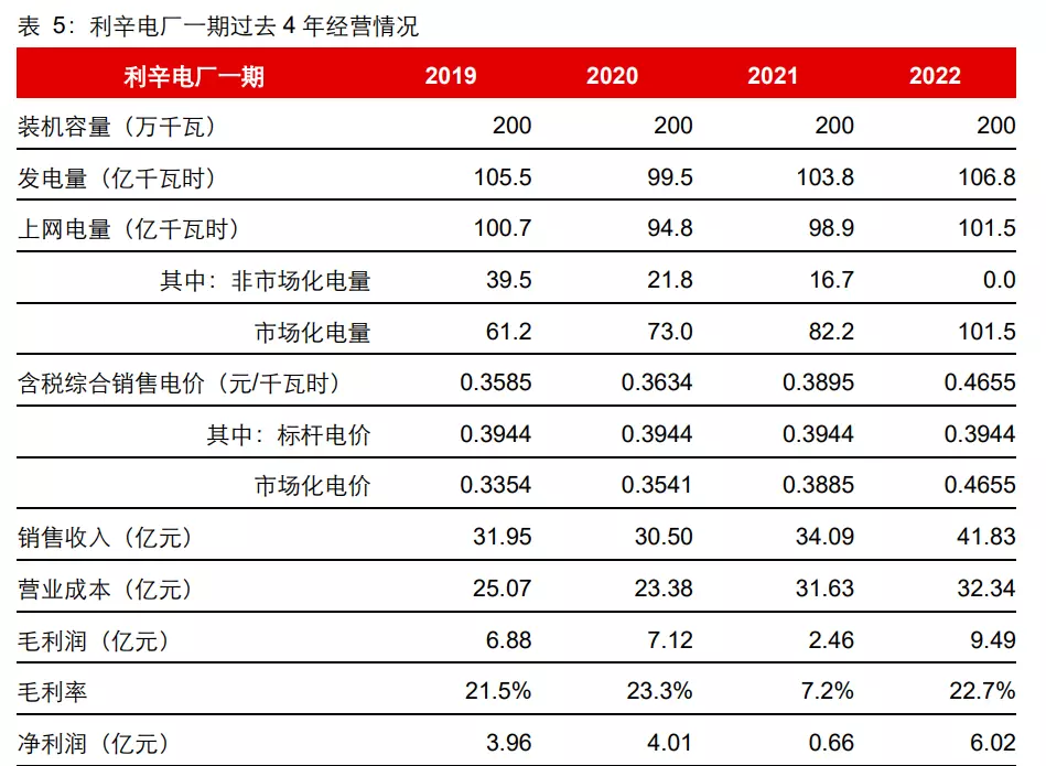 2、上网电价:考虑到利辛电厂从 2022 年开始就全面市场化,不考虑安徽省标杆上网电价,以 2022 年的市场化电价为基准;