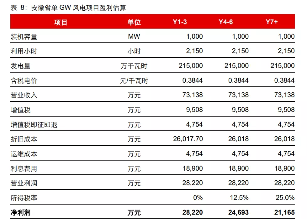3、上网电价:考虑平价上网,以安徽省含脱硫脱硝除尘的燃煤标杆上网电价为平价目标,为 0.3844 元/千瓦时;