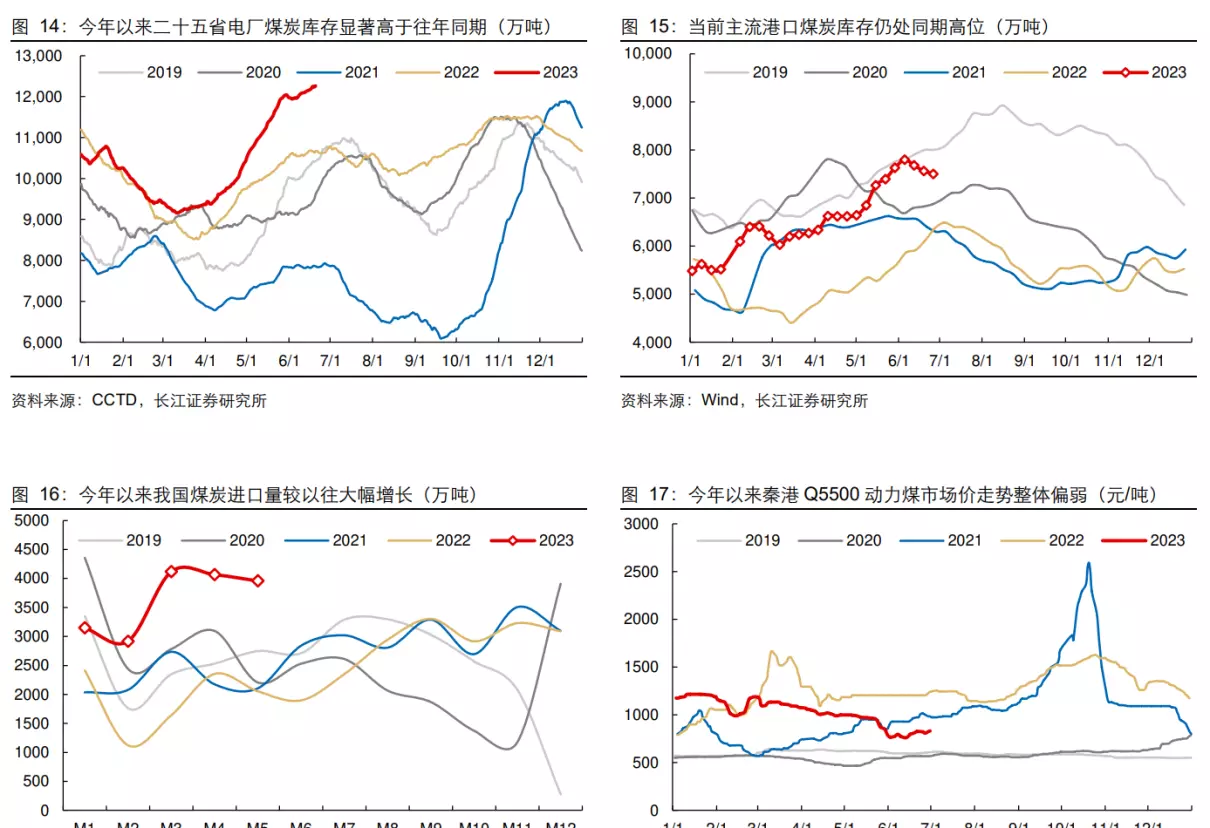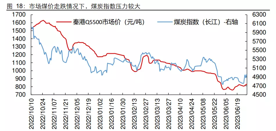 价格的持续走弱也影响到了今年的煤炭指数,长江煤炭指数从去年 10 月左右的高点 6000 点左右下降到今年 6 月的 4700 点左右的位置,降幅超过 1/3。