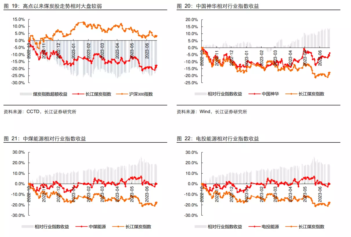 与整体走弱的煤炭指数相对,行业中经营情况偏稳定、长协比例偏高、受益于长协价格调升的公司整体走势相对较稳定,表现出较强的抗跌趋势,其中代表的公司有中国神华、中煤能源和电投能源。