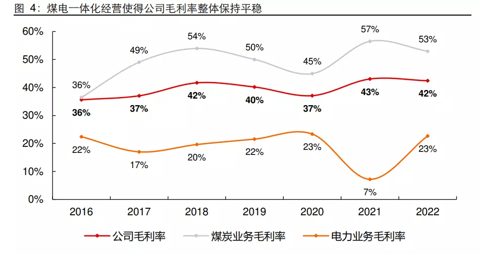 1)业绩稳健性:公司煤炭长协比例高、叠加煤电一体化运营,业绩稳定性较有保障。公司煤炭长协比例高达 80%-90%,盈利整体较稳健,叠加煤电联营的优势,近年来毛利率稳定在 36%-43%之间。