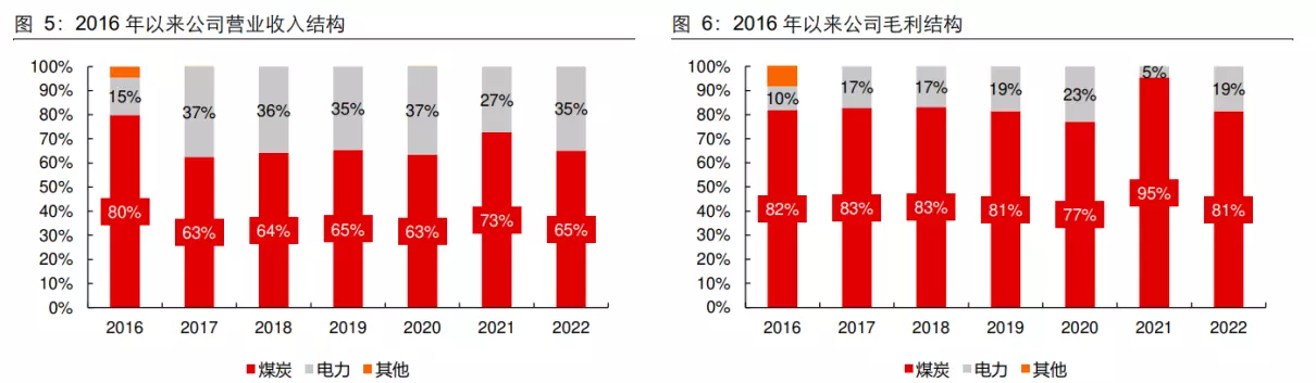 公司 2017 年开始专营煤炭和电力业务,其中煤炭业务贡献大部分营收和毛利。2022 年煤炭业务实现营业收入 78.20 亿元,占总营收的 65%,实现毛利 41.41 亿元,占总毛利的 81%。从毛利率走势来看,或得益于煤电一体化经营,公司近年来毛利率整体保持在 36%-43%之间。