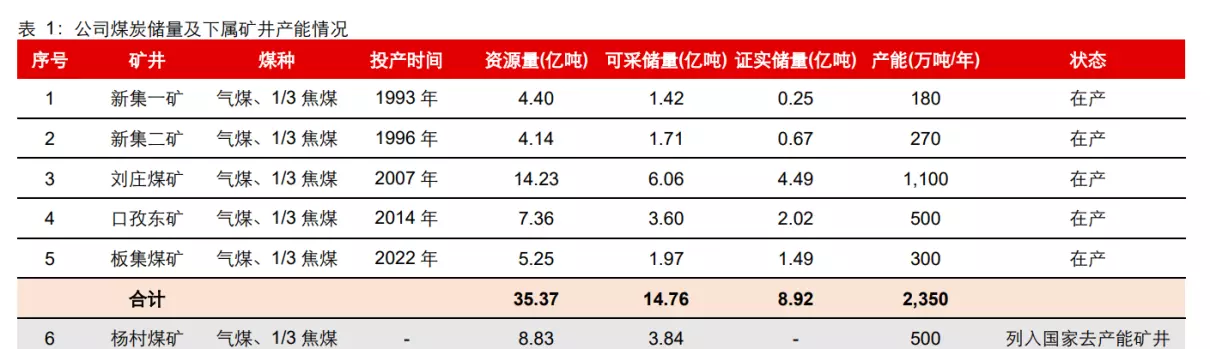 煤炭业务:公司下属矿井主要产品为动力煤,煤种主要为气煤和部分 1/3 焦煤,具有中灰、低硫、特低磷、高挥发分和高发热量等特征。截至 2022 年末,公司拥有 5 对生产矿井,可采储量合计 14.76 亿吨,核定产能合计 2350 万吨/年。