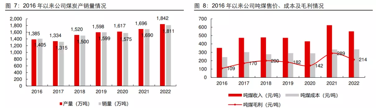 受益于 300 万吨/年板集煤矿项目正式投产,2022 年公司实现商品煤产量 1841.90 万吨,同比增长 145.87 万吨,增幅 8.60%;实现商品煤销量 1811.03 万吨,同比增长 120.96 万吨,增幅 7.16%。