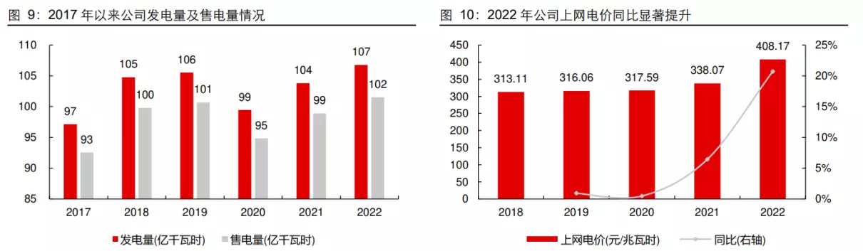 公司近年来发电量及售电量整体保持平稳,2022 年二者分别达到 106.78 亿千瓦时和 101.54 亿千瓦时,同比分别提升 2.87%和 2.68%,创历史新高。