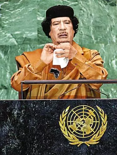 而卡扎菲的高光时刻,就是在2009年的联合国大会上。按照规定,每个上台的国家领导人进行发言,但是只能进行十五分钟的演讲。但是刚在2008年加冕成为了“万王之王”的卡扎菲此时正处于极度膨胀的状态。他无视了这条规定,直接在台上口若悬河、大放异彩,放飞自我一般絮絮叨叨地说了一个半小时。