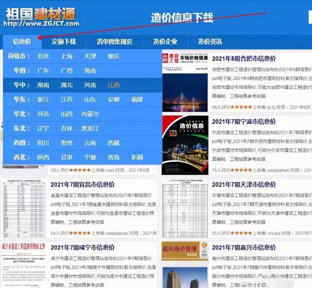 进入后默认是显示全中国信息价,要慢慢找一下江西的,也可以把鼠标移到导航上的 信息价 栏目,下面有划分好省信息价的