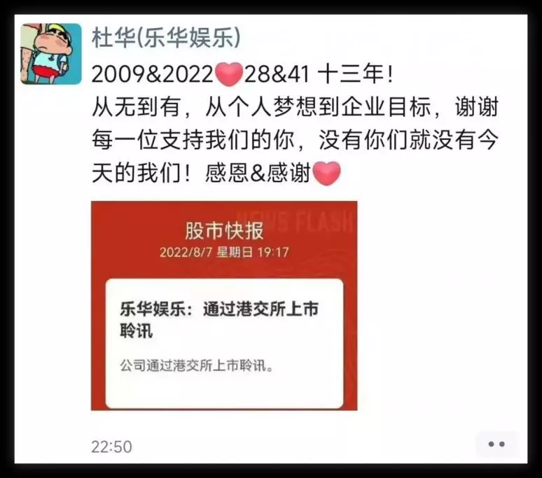 成功总是来得波折。彼时,一切似乎已经水到渠成,杜华还在朋友圈发表了感言。然而2022年9月,暂缓港股IPO的消息传来。彭博社援引知情人士消息称,乐华预期IPO融资1.4亿美元,但投资者意向未达乐华估值预期,公司决定暂时搁置上市计划等待更好的市场环境。三个月后,乐华娱乐再次递表,赴港上市重启。