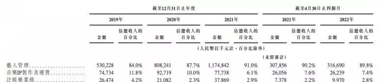 招股书显示,2019年、2020年、2021年,乐华营收分别为6.31亿元、9.22亿元、12.9亿元,其中,三大业务之一的“艺人管理”,收入分别占同期总收入的84%、87.7%、91%。