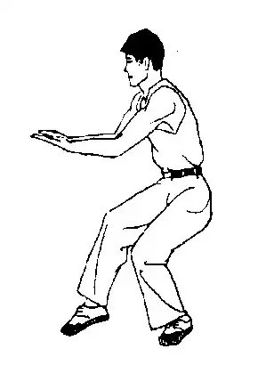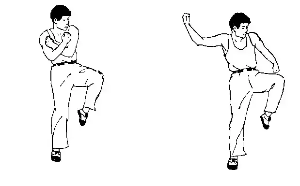 ① ② ③ ④上体左移,体重大部落于左腿,拳变掌叉于裆前,脚收后虚步。右转身起右脚猛力下踏的同时,起左脚自然屈膝,两掌上下反放于右肋前,掌心向前。用途:推胯,肋,将对方摔倒。 (十三)上步砸肘: