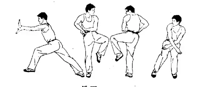 ① ② ③ 右 转身 ,右 脚尖 外 摆 并猛 力 下踏:左脚成左弓步,右手向前上挑,左手抓握,右小臂,右后转体成右弓步的变掌屈肘下压,掌心向下,两小臂略平置刁:腹前。用途:别臂压肘。第二段虚步砍肋: