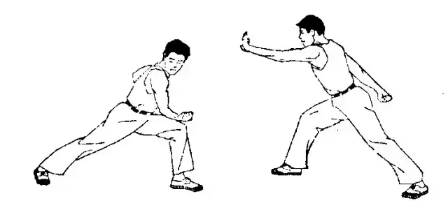 (图1右拳从腰间冲出,拳心向下,同时左拳收于腰间,成左弓步(图10)。用途:击面、胸或腹部。(二)穿喉弹踢: