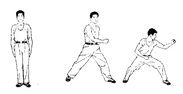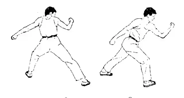 ② ② 反面右脚前落地成右,同时手前伸变八字掌,右自然左转身成马步的同时,左手抓拉收于腰间,右拳向前猛力横击,臂微屈,拳与肩同高,拳心向下。用途:击头或腰部。内拨下勾: