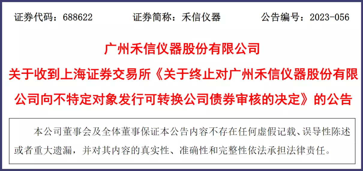 近日,禾信仪器终止了向不特定对象发行可转换公司债券的申请,并于7月6日收到了上交所终止审核的决定书。