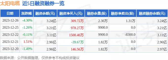 太阳电缆融资融券信息显示,融资方面,当日融资买入1055.06万元,融资偿还745.34万元,融资净买入309.72万元,连续3日净买入累计2788.39万元。融券方面,融券卖出1.31万股,融券偿还0.0股,融券余量2.3万股,融券余额18.95万元。融资融券余额3.24亿元。近5日融资融券数据一览见下表: