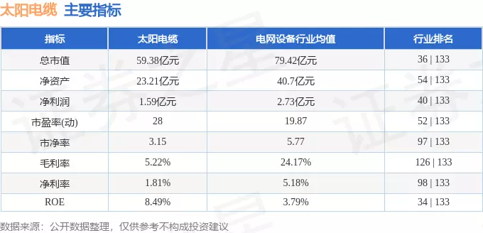 太阳电缆2023年三季报显示,公司主营收入97.04亿元,同比上升0.69%;归母净利润1.59亿元,同比上升7.0%;扣非净利润1.49亿元,同比上升15.28%;其中2023年第三季度,公司单季度主营收入39.85亿元,同比上升18.39%;单季度归母净利润6122.11万元,同比上升9.79%;单季度扣非净利润5849.76万元,同比上升23.02%;负债率64.79%,投资收益1382.5万元,财务费用3529.72万元,毛利率5.22%。太阳电缆(002300)主营业务:主要从事电线电缆的生产和销售。