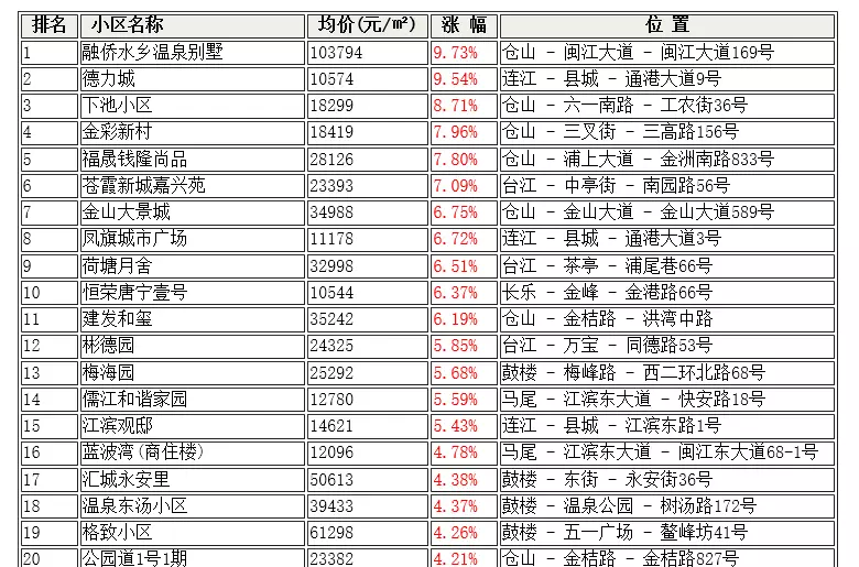 1、融侨水乡温泉别墅:103794元/㎡,上涨+ 9.73%,位置:仓山 - 闽江大道 - 闽江大道169号