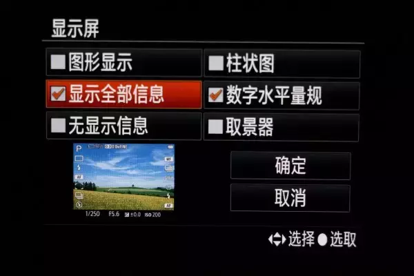 其实在设置中找到“DISP按钮”,进去之后可以选择取景器和屏幕的显示内容,我根据使用习惯,仅选择显示水平仪和所有参数,别的功能对我来说没什么用,各位朋友可以根据自己的需要来进行设置。