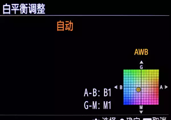 然后在白平衡的色彩漂移里(白平衡选项中按方向键右键),将色彩漂移设定为B1M1,起到消除黄绿的效果。