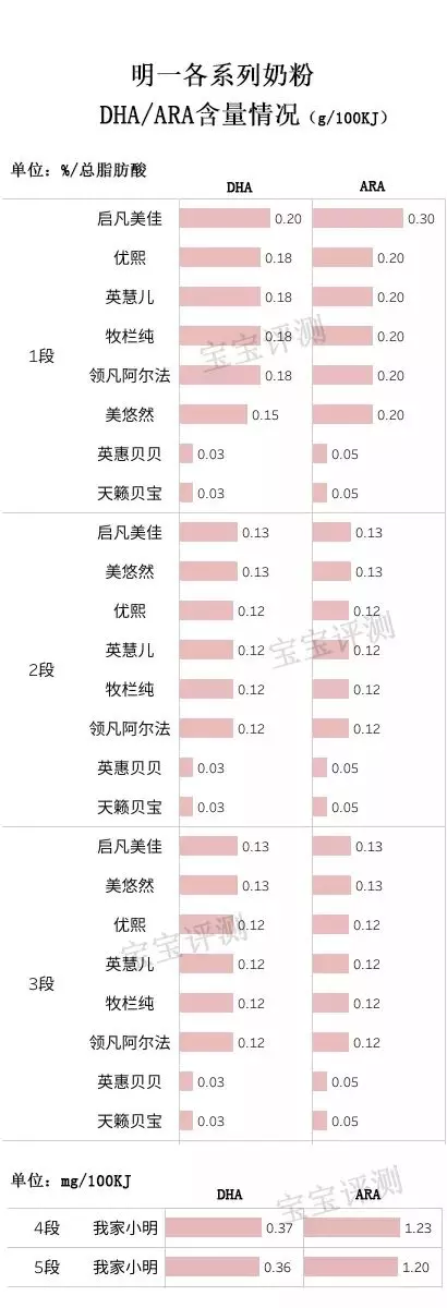 ②明一各系列全段的DHA添加量都比较低,很难说光靠吃奶粉能发挥多大的作用,因此都不能得到加分。
