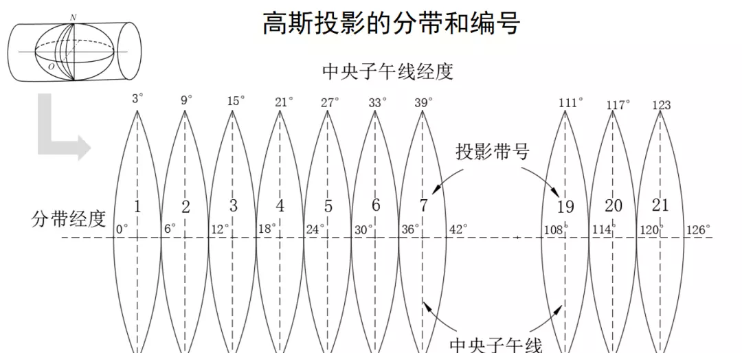 这里简单解释一下高斯投影与坐标分带。高斯投影是等角横切椭圆柱投影,等角投影就是正形投影,就是在极小的区域内椭球面上的图形,投影后保持形状相似,即投影后角度不变形。